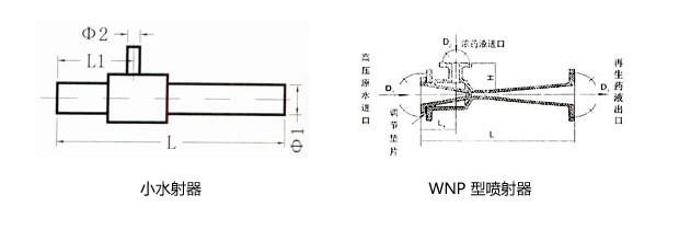 高壓原水通過(guò)管道閥門(mén)進(jìn)入噴射器的漸縮段,將靜壓頭轉(zhuǎn)換成動(dòng)能,在噴嘴處成為高速射流,使混合室形成微真空狀態(tài),將高濃度的再生藥液吸入混合室,并使再生藥液的壓力和速度發(fā)生變化;在混合段內(nèi),水和藥液得到充分地混合,然后注經(jīng)擴(kuò)散段,使再生液減低流速,靜壓頭升高,再通過(guò)出口管道及閥門(mén)將稀再生液送到交換器本體中。